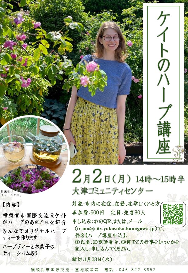 横須賀市国際交流員ケイトがハーブのあれこれを紹介します。みんなでオリジナルハーブティーを作ります。ハーブティーとお菓子のティータイムもあります!