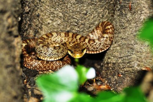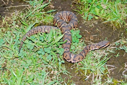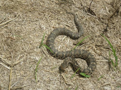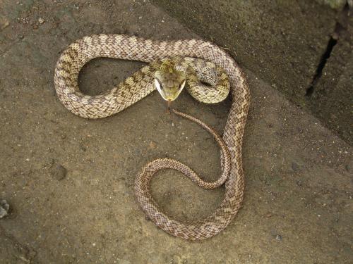 特に、アオダイショウの幼蛇は、斑紋(はしご状の模様)があることから、ニホンマムシと間違われることがあります。幼蛇は、人に出会うと頭を三角にして威嚇し、咬みついてくることがありますので、ご注意ください。