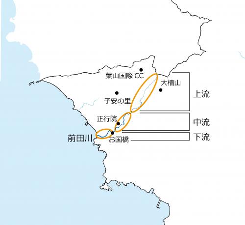 前田川は、大楠山を水源とする全長約3.5kmの小河川で、小さな滝を伴った渓谷を形成しながら流れる河川で、上流から中流にかけては樹林地の中を流下するなど、三浦半島では自然が残された数少ない川のひとつです。