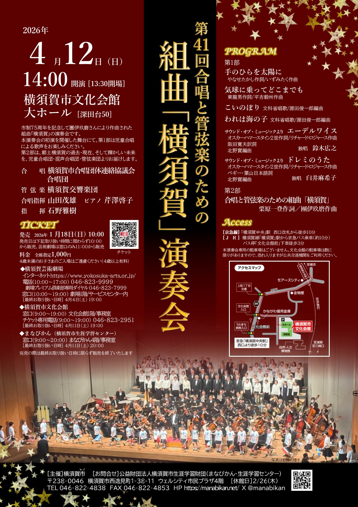 市制75周年を記念し、世界的作曲家の團伊玖磨氏が作曲した組曲「横須賀」の第41回演奏会を開催いたします。郷土横須賀の過去・現在、そして輝かしい未来を描いた組曲「横須賀」は、昭和57年に制作された作品で、昭和58年2月、團伊玖磨氏が指揮をつとめ、文化会館にて初披露されました。