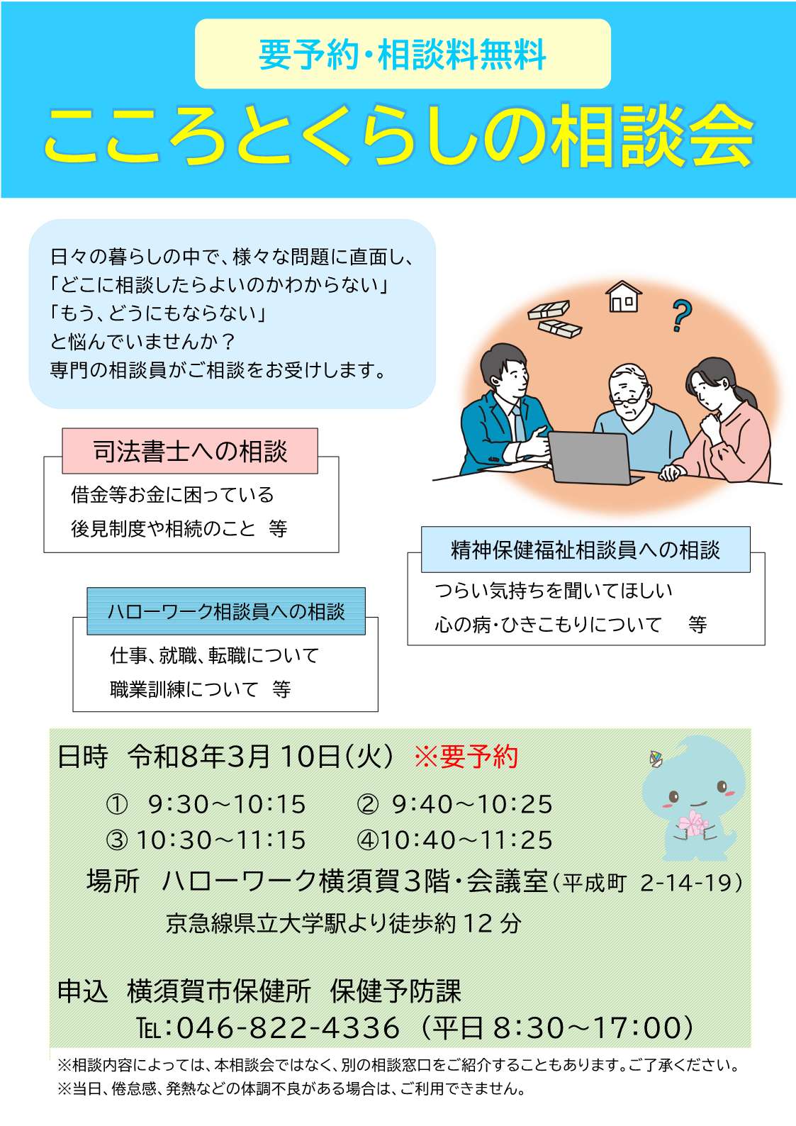 自殺対策基本法で定められている「自殺予防週間(9月10日から16日)」と「自殺対策月間(例年、月別自殺者数の最も多い3月)」のある9月と3月に、法の趣旨に基づき、保健所と横須賀公共職業安定所と協力し、心の健康相談をより積極的に実施するとともに、失業者等に対するワンストップサービスになるよう、ハローワーク横須賀を会場に包括相談会(こころとくらしの相談会)を開催しています。